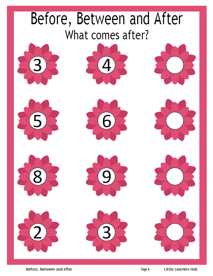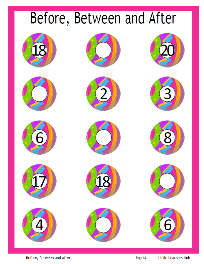 This Before, Between & After worksheet pack from Little Learners Hub helps children learn and practice number order for numbers 1 to 20. It includes 25 fun and interactive pages that introduce children to early number sequencing using fill-in-the-blank, cut and paste, and number line activities.