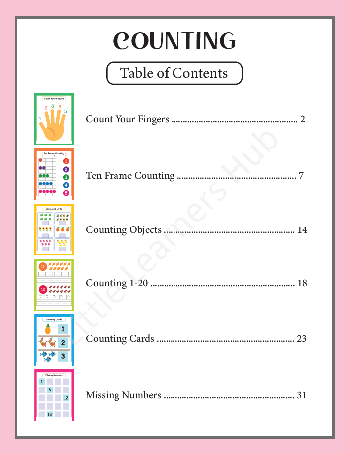 This 31-page Counting Worksheets Pack from Little Learners Hub is designed to help young children develop their counting skills in a hands-on and engaging way. Through visual counting, number matching, and writing numbers, students build a strong foundation in early math concepts.