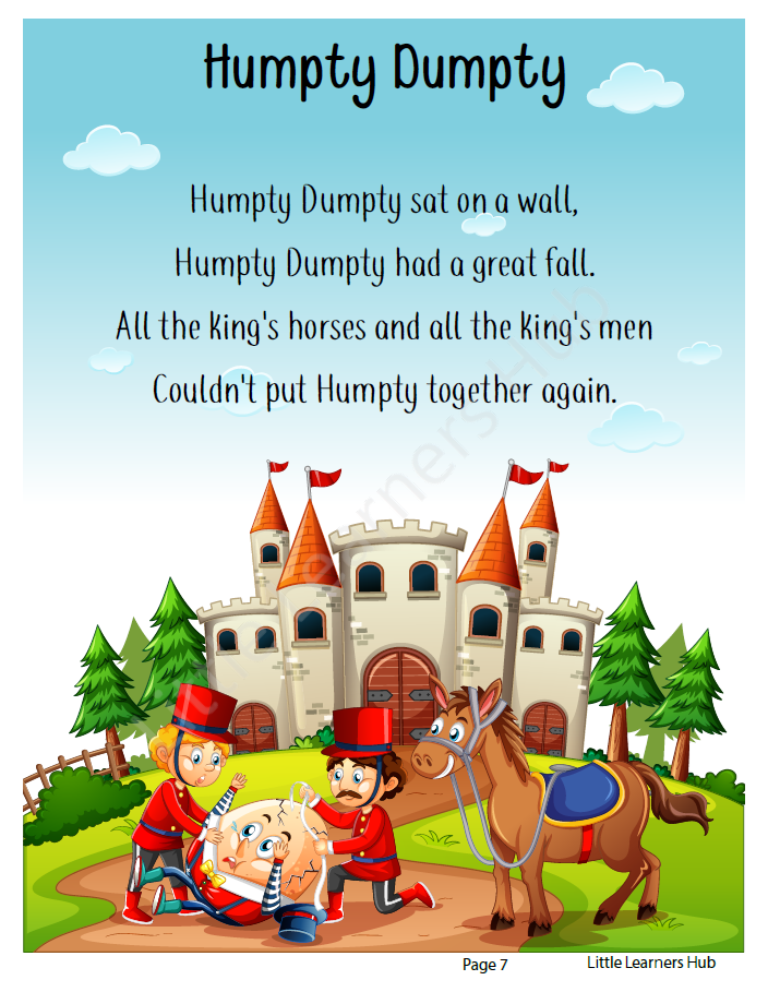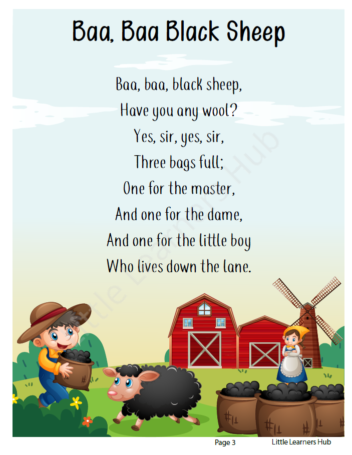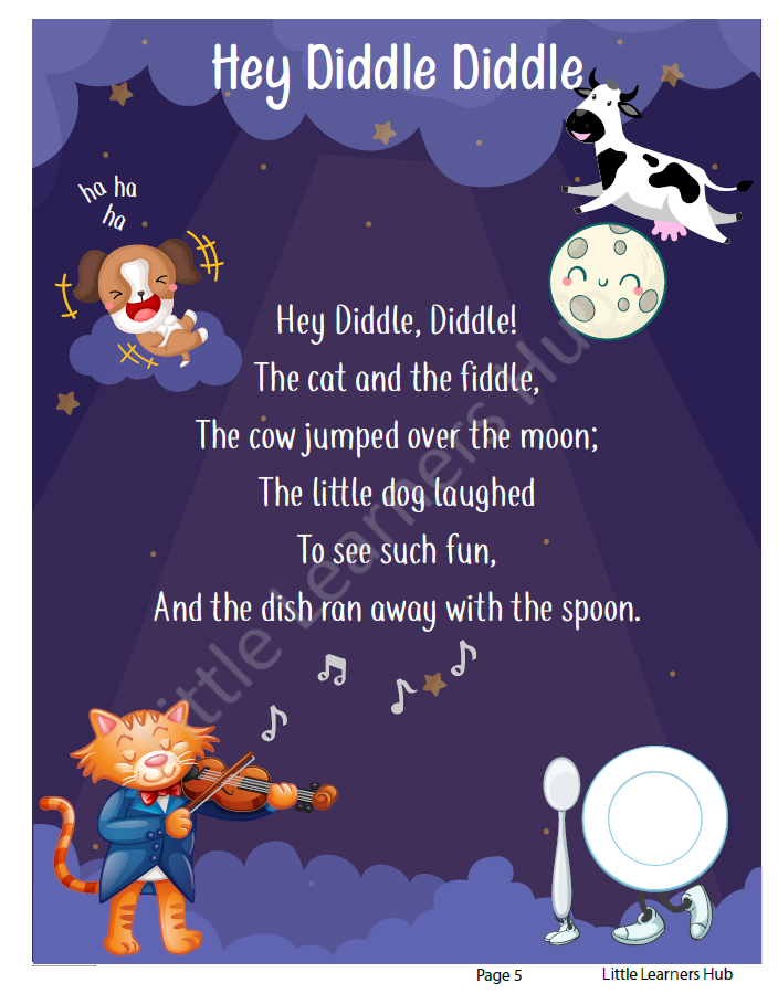 Redistribution or resale of the digital file is not allowed. All rhymes included are in the public domain, and layout/design is created by Little Learners Hub.