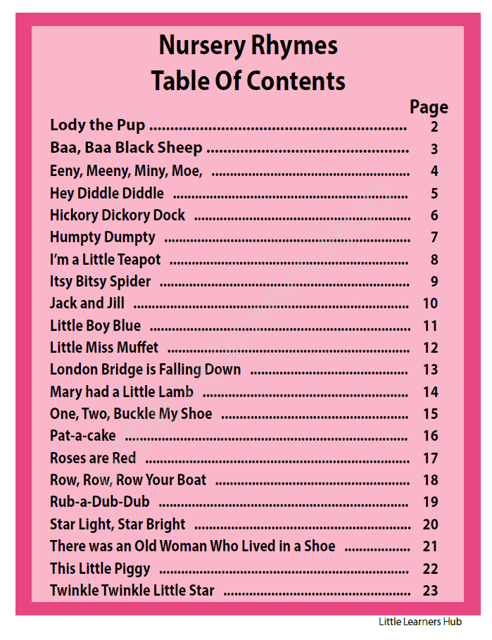 23 printable nursery rhymes (one per page)