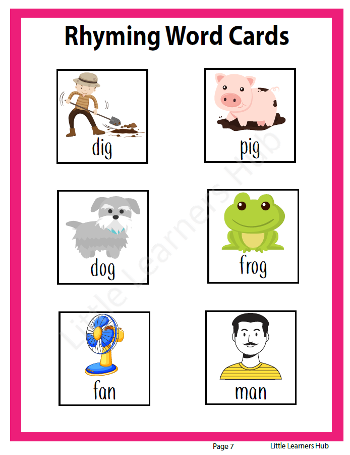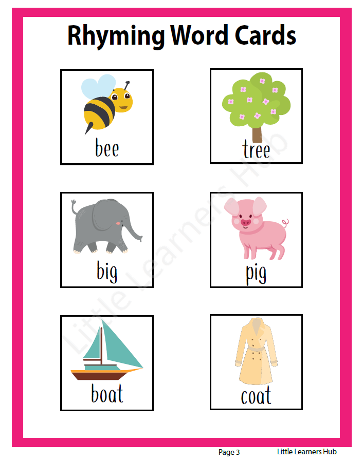 cat – hat, dog – frog, sun – fun, bee – tree, log – fog