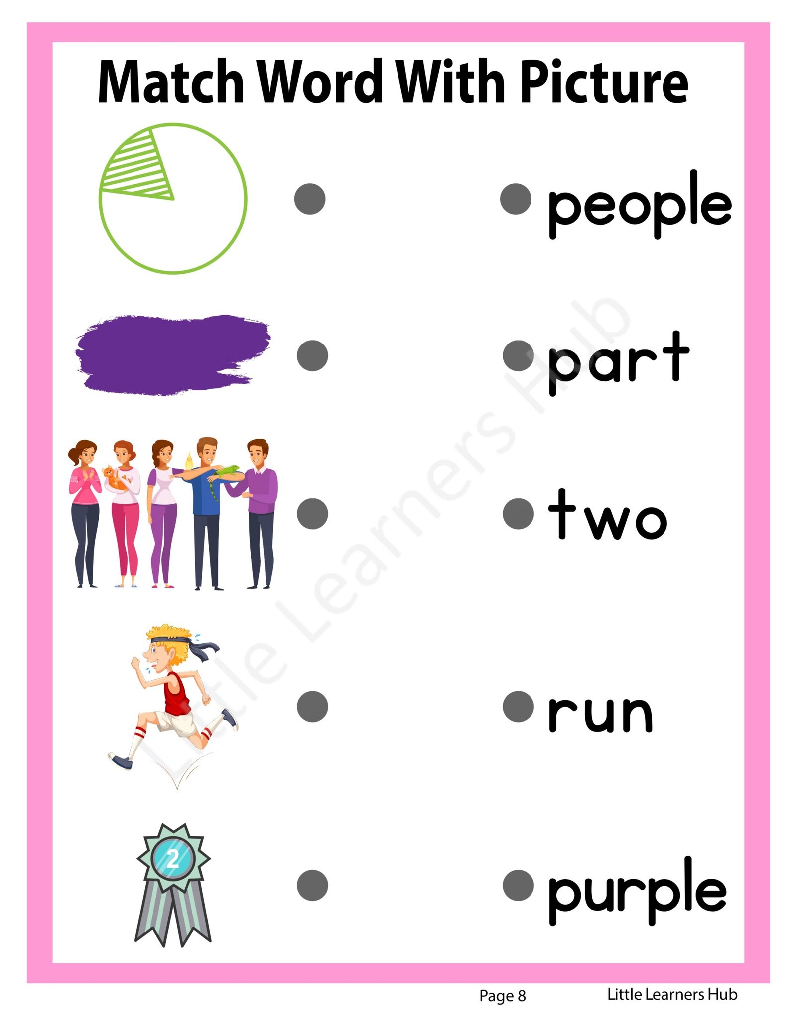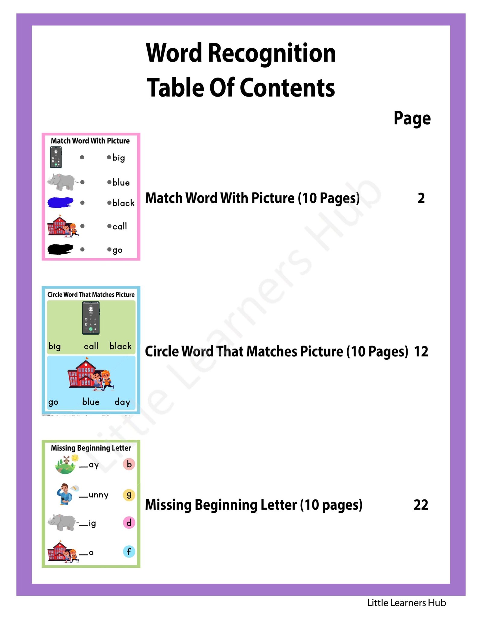 This 31-page printable pack is specially designed to develop word recognition skills through interactive and engaging activities. Children will practice reading simple words, matching them to pictures, and coloring or circling correct choices — reinforcing their ability to read, comprehend, and visually recognize words.